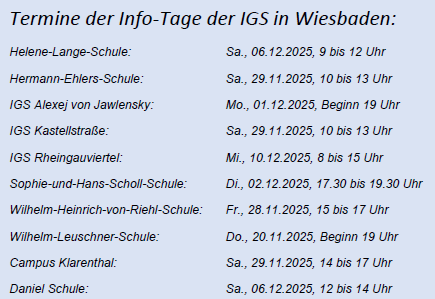 Die Integrierten Gesamtschulen der Stadt Wiesbaden möchten sich Ihnen auf dieser Internetseite als schulisches Angebot und Alternative zum dreigliedrigen Schulsystem (Hauptschule, Realschule, Gymnasium) vorstellen.